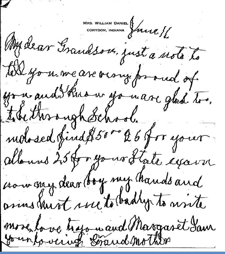 Letter to Ted from his maternal grandmother Fredrica Martin Daniel, written June 11, 1929, after Ted’s graduation from medical school. She was badly crippled by rheumatoid arthritis. “My dear Grandson, Just a note to tell you we are very proud of you and we know you are glad to be through school. Enclosed find $50, $25 for your albums and $25 for your State exam. Now my dear boy my hands and arms hurt me to badly to write more. Love to you and Margaret. I am your loving Grandmother.”