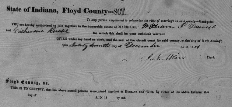 Daniel Ancestors 06 Monday Oct 2014 Original size at 1097 × 510 ≈ Comments Off on WmSDaniel_FloydCountyMarriageRecordsBook3p397 Wm S Daniel and Catherine Russell, Dec. 27, 1851, Floyd County Marriage Records Book 3 pg 397