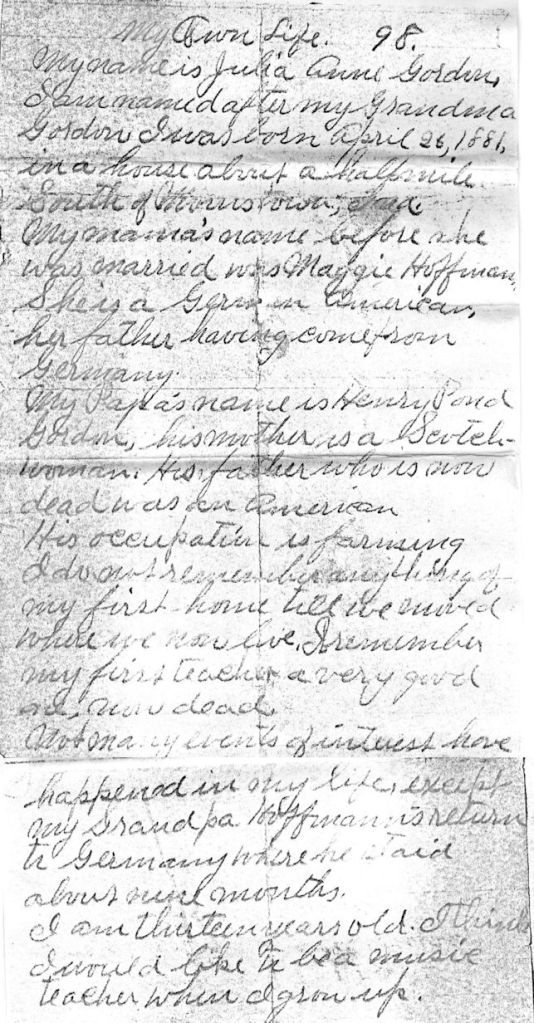 Gordon Ancestors 20 Tuesday Jun 2017 Original size at 643 × 1232 ≈ Comments Off on Julia_Gordon_My_Own_Life_1894_sm “My Own Life” written by Julia Anne Gordon in 1894. She was maternal grandmother of the Applegate girls.