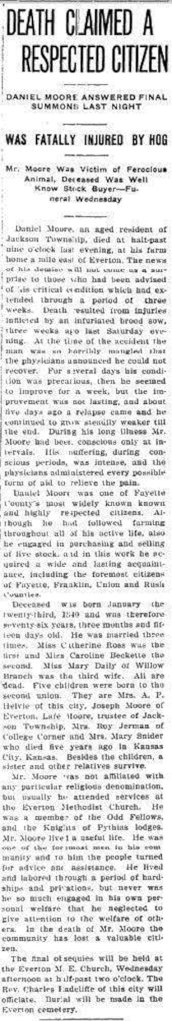 Misc Stories – maternal side 20 Thursday Jul 2017 Original size at 381 × 2262 ≈ Comments Off on Daniel_Moore_fatally_injured Daniel Moore fatally injured by hog, April 1916