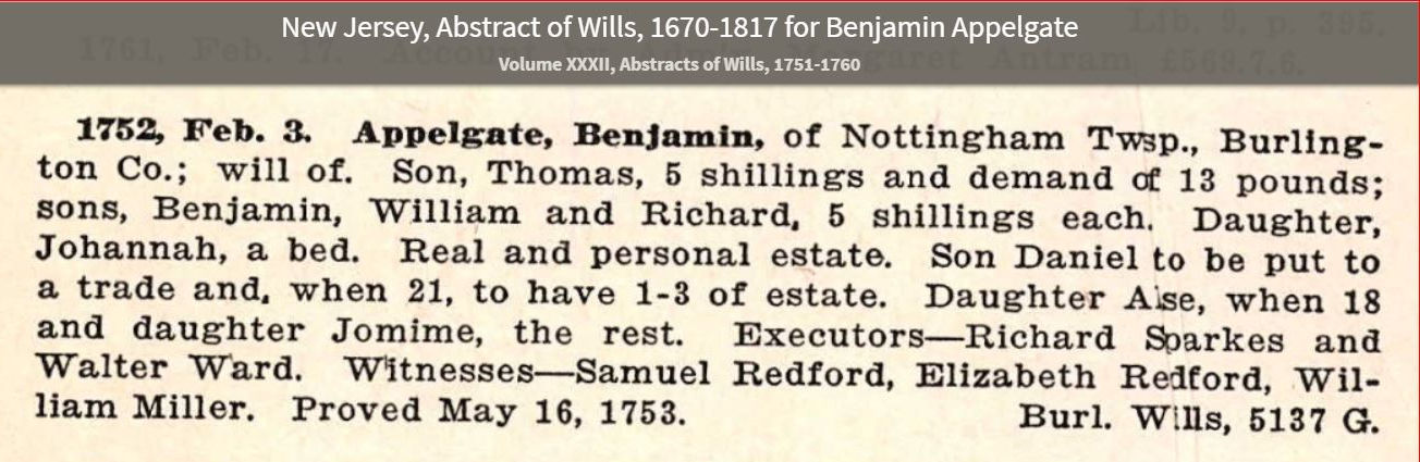 Applegate Line-paternal 24 Saturday Jun 2017 Original size at 1304 × 425 ≈ Comments Off on Benjamin Appelgate will 03 Feb 1752 Will of Benjamin Applegate 3 Feb 1752