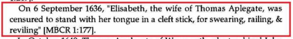 Applegate Line-paternal 24 Saturday Jun 2017 Original size at 578 × 78 ≈ Comments Off on Elizabeth_1636 Story of Elizabeth Applegate’s (1604-1656) sharp tongue