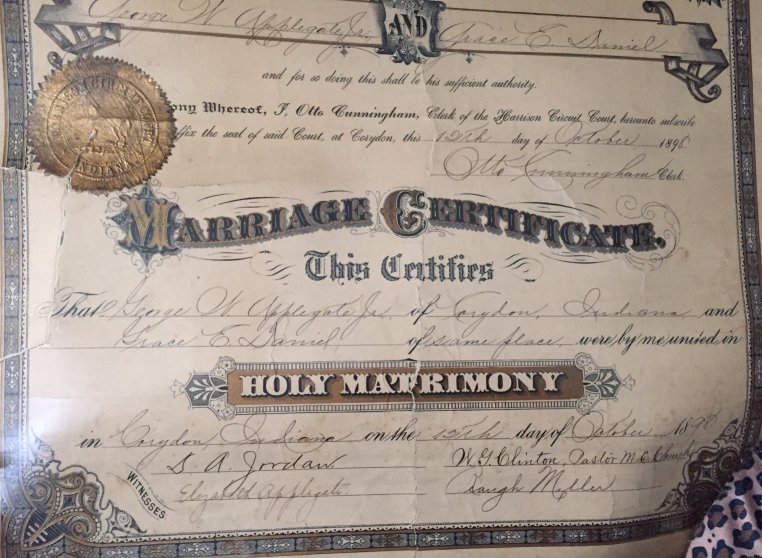 Applegate Line-paternal 24 Saturday Jun 2017 Original size at 1525 × 1117 ≈ Comments Off on GWA_II_Papa_Bobbie_mar_cert_1898 Marriage certificate of George W. (Papa) and Grace (Bobbie) Daniel Applegate, 12 Oct 1898