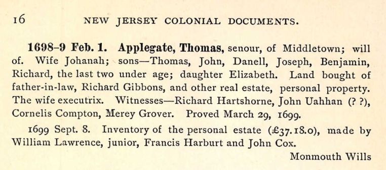 Applegate Line-paternal 24 Saturday Jun 2017 Original size at 1209 × 534 ≈ Comments Off on Thomas_Applegate_Jr_will_1Feb1698-9 Will of Thomas Applegate Jr, 1698-99