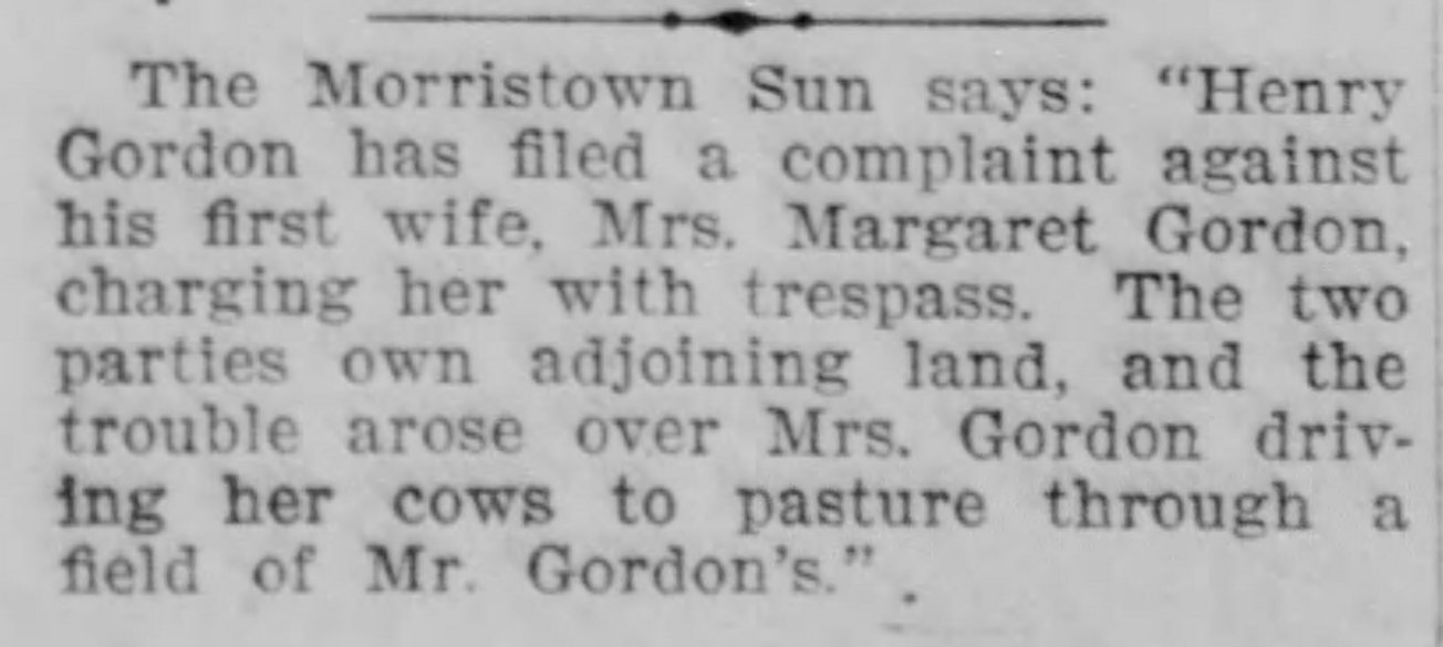Gordon Line-maternal 02 Sunday Jul 2017 Original size at 1304 × 585 ≈ Comments Off on trespass_complaint_Hancock_Democrat_Jun23_1910 Complaint filed by Henry Gordon against Margaret Gordon, 23 Jun 1910