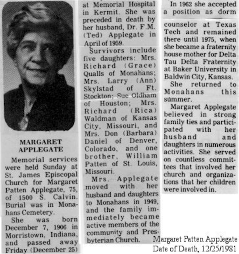 Patten Line-maternal 26 Monday Jun 2017 Original size at 819 × 870 ≈ Comments Off on mag_obit1 Margaret Patten Applegate obituary, 1981